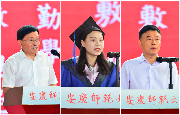 2019年校“教书育人”最美老师、外国语学院教授郝涂根代表全体教师发言。他用真诚恳切的语言,表达对全体毕业生圆满毕业的欣喜之情与离开母校的惜别之情,同时也提出了对毕业生们的殷切期望。“希望你们勇做新时代的弄潮儿,成为让母校自豪的‘安庆师大人’。要不断提高干事创业的本领,向书本学、向他人学、向社会学、向实践学,成为社会主义的建设者和接班人。”