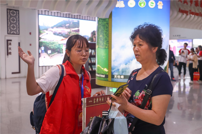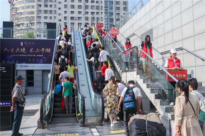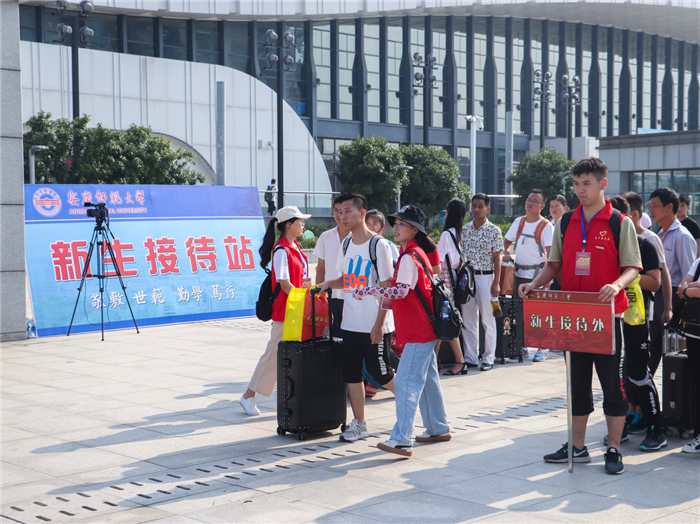 从出站大厅到出站口,再到学校的新生接待处,志愿者们排成一列列红色的队伍,在人群拥挤的车站十分显眼,一路为新生提供导航和引导服务。“有了他们,我很容易就找到了报道的地点。”新闻学2019(2)班的杨逸媛来自遥远的广西玉林,她在9月5号晚上便从家出发,历时30个小时才到达安庆,原本担心来到陌生的城市会迷路的她,出站后看到路上都是学校的志愿者便放下了心。