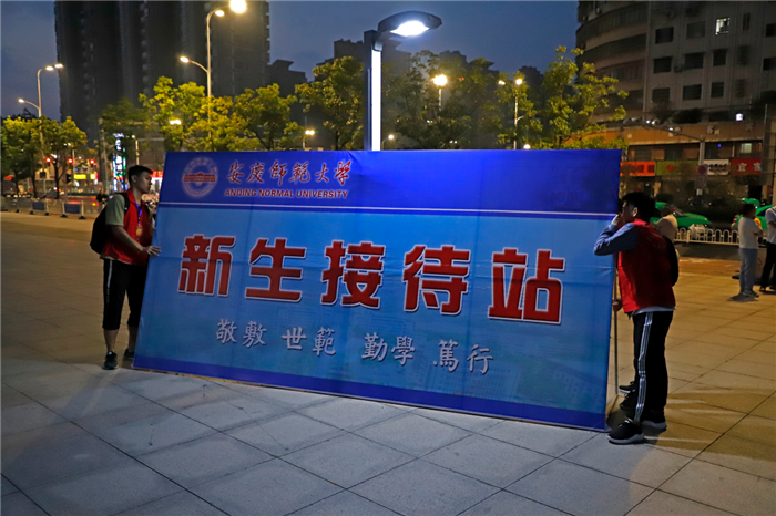 “刚出站,我便很惊喜,没想到这么快就找到了大部队。”广播电视学2019(1)班的孟飞独自搭乘夜班火车前来,当他出站马上就看见印有校名的红色马甲时,八个小时的疲倦和孤独便烟消云散了,他抑制不住自己的兴奋,笑着说,“这虽然是我第一次来安庆,但很有归属感。”