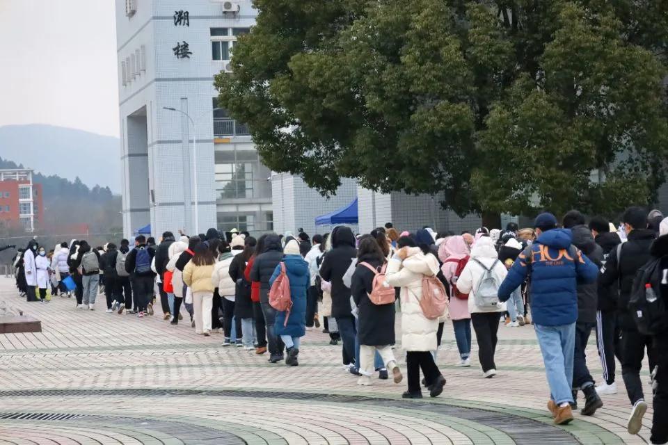 “我像往常一样六点半起床,以平常心对待这次考试,虽然天气寒冷,但与室友一起考试心里非常温暖。”项裕婷同学与室友并肩拼搏,约定一起考研“上岸”,“学校老师与工作人员也在寒风中陪伴着我们,他们辛苦付出,细致周全地为我们服务,我们会拿出最好的状态考试。”考前一个小时,不少学生在食堂就餐时仍在复习,前往考场途中背诵知识点、相互讨论题型、彼此拥抱加油鼓劲。考场外,学生或稳步向前或快速奔向考场,现场不时能听到老师对学生们的鼓励。