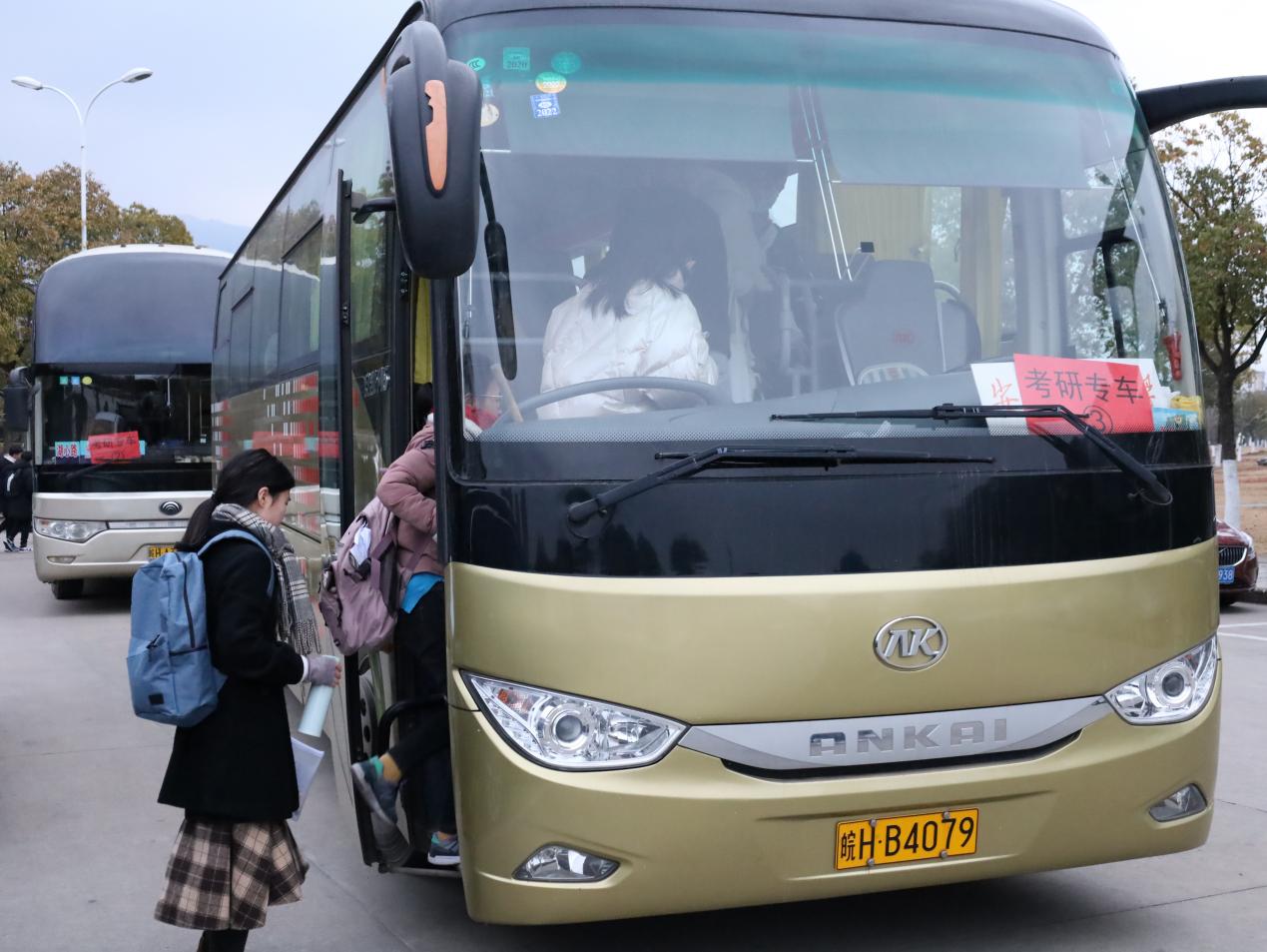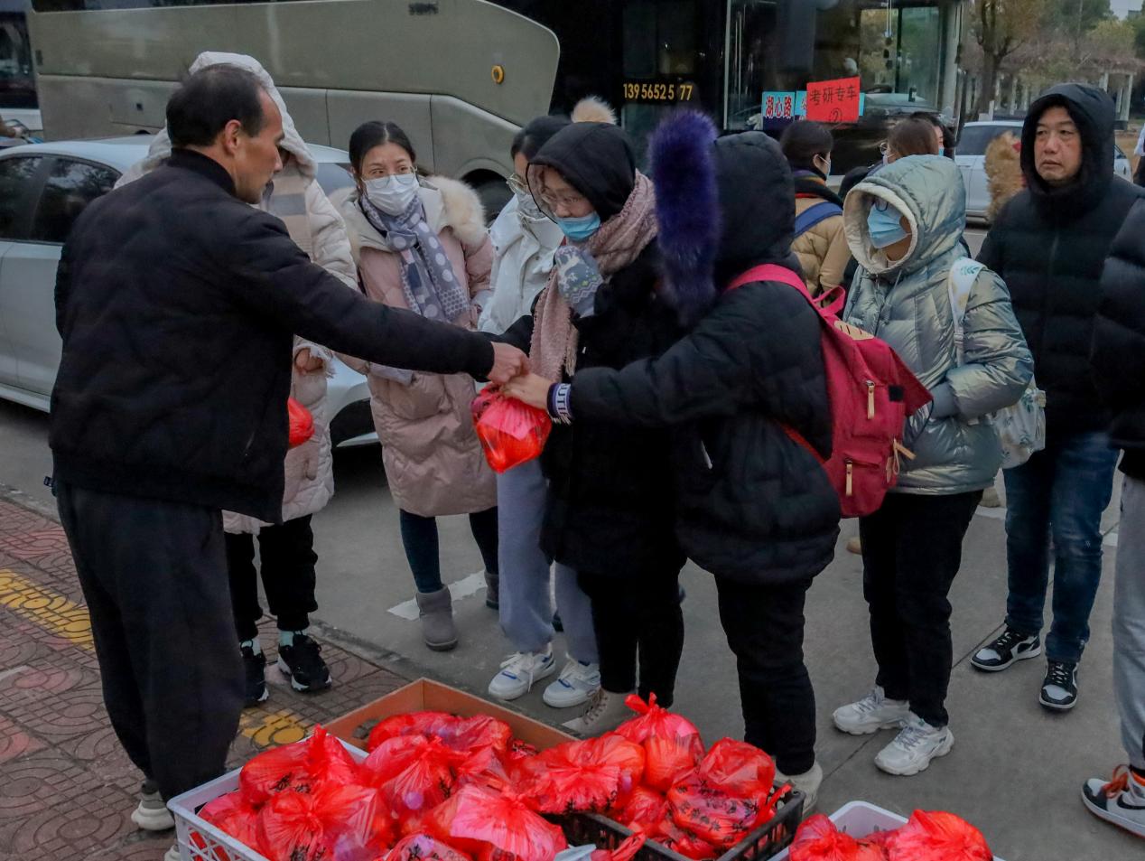 因考点安排在龙山校区,学校派出4辆考研专车接送菱湖校区160余名考生,并在考试结束后为考生送上考研礼袋,苹果、橘子、矿泉水以及一张写有“心想事成,成功上岸”字样的考研祝福卡,160余份礼物在20分钟内全部发放完毕。“我们尽量快速发放,不耽误学生休息和复习。”现场工作人员表示,两个校区之间有近半个小时的车程,学生不能立即用餐,准备一些零食让他们“垫肚子”,给他们一些鼓励和安慰。