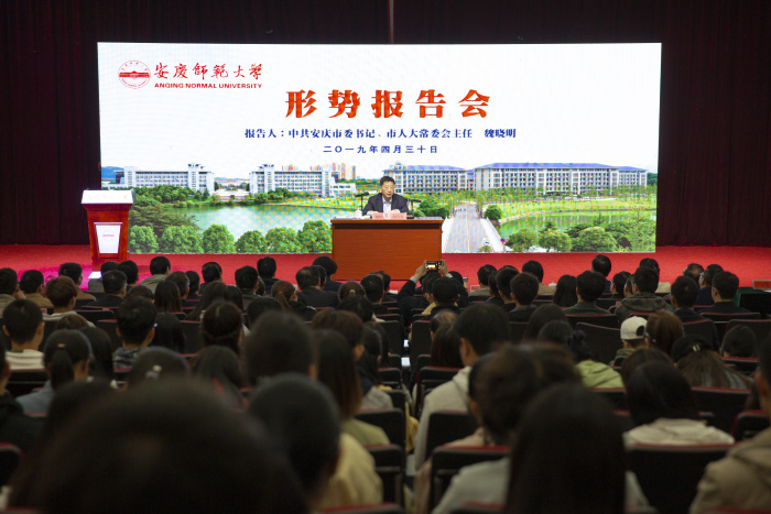 4 月30 日上午,在“五四”青年节来临之际,安庆市委书记魏晓明来校调研,并为400余名师生作形势报告。