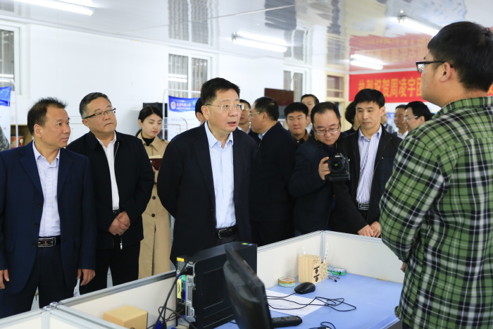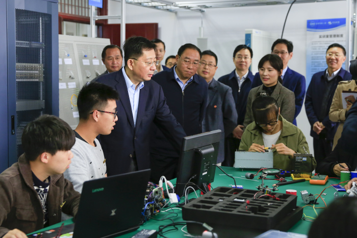魏晓明一行实地考察了计算机与信息学院、物理与电气工程学院、马克思主义学院、教师教育学院和生命科学学院等地,深入了解了智能感知与计算安徽省高校重点实验室、教育部ICT产教融合创新基地、水生生物保护与水生态修复安徽高等学校工程技术研究中心等重点研究平台和实验室的建设和运行情况,与研究人员和师生亲切交谈。在逸夫图书馆广场前,魏晓明一行观看了beat365英国官网网站第八届“挑战杯”大学生课外学术科技作品展,听取了参赛团队的路演汇报。