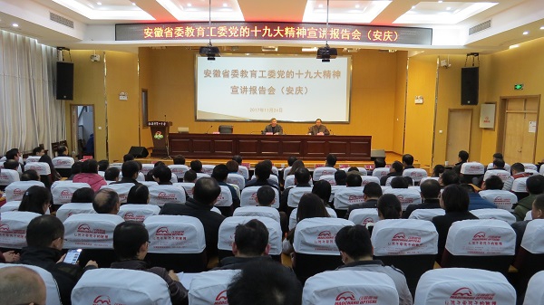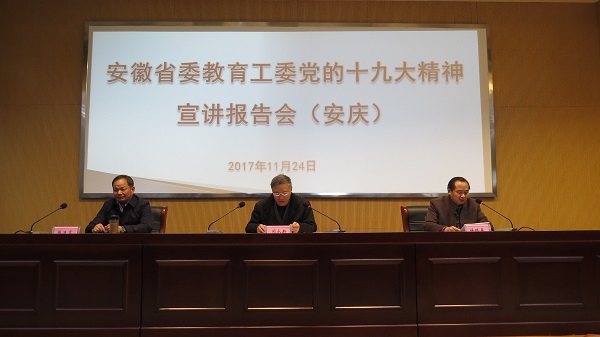 为认真学习、大力宣传、全面贯彻党的十九大精神,11月24日,省委教育工委党的十九大精神宣讲报告会在安庆二中报告厅举行。省委教育工委宣讲团成员、beat365官网党委副书记、校长闵永新作专题报告。省教育厅基教处副处长张连富出席会议。报告会由市教体工委书记、市高教工委书记、市教体局局长徐晓春主持。
