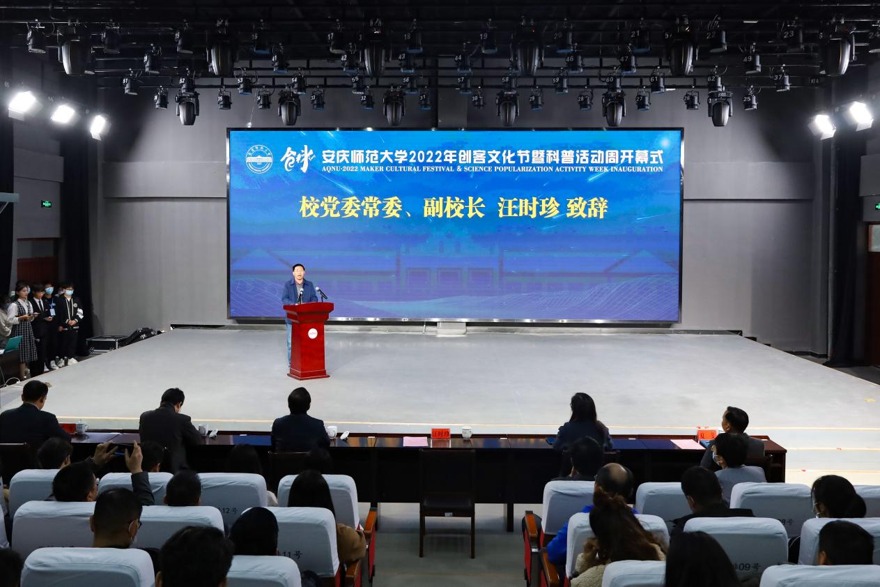 校党委常委、副校长汪时珍出席开幕式并致辞。汪时珍代表学校对本次活动的举办表示热烈的祝贺,与师生代表携手共同启幕。汪时珍指出,创客文化节暨科普活动周是充分展示学校双创教育和产学研合作成果、提升大学生科技创新能力、发掘创业新秀的重要途径。他强调,科技创新和科学普及,是实现创新发展的两翼,抓科普就是抓科创,抓科创就必须抓科普;让更多青年学子了解科技文明、体验科技创新,才能让创新智慧充分释放、创新力量充分涌流。汪时珍要求,各相关部门、各学院要教学互动,紧抓人才培养“能量核”;要搭梁架柱,抓实产学研合作“支柱点”;要以赛促创,提振科创赛事“增长级”,合力为“挑战杯”等竞赛项目孵化创造良好环境。