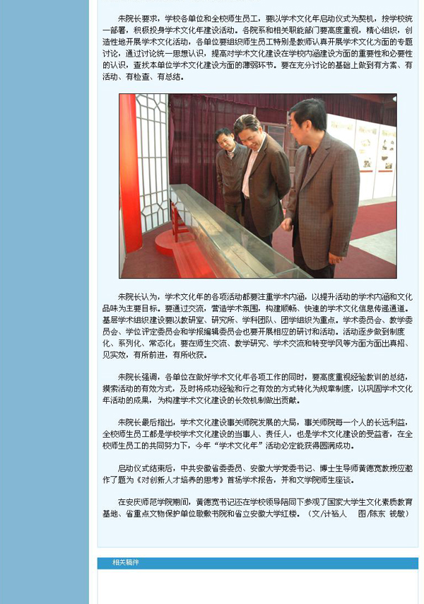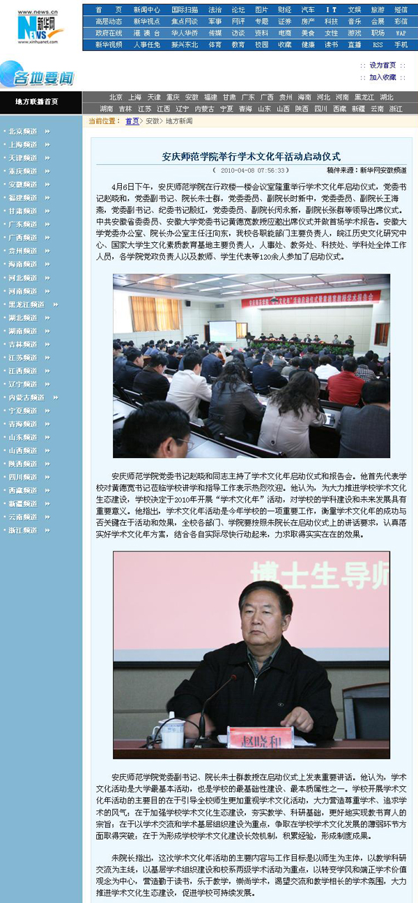 “学术文化活动是大学最基本活动,也是学校的最基础性建设、最本质属性之一。”4月6日下午,beat365官网在行政楼一楼会议室隆重举行学术文化年活动启动仪式,并邀请安徽大学党委书记黄德宽教授做题为《对创新人才培养的思考》首场学术报告,新闻经beat365官网网站发布后,立即被新华网、中国网、网易、新民网和安徽省教育厅网站首页转发报道,产生了很大影响。