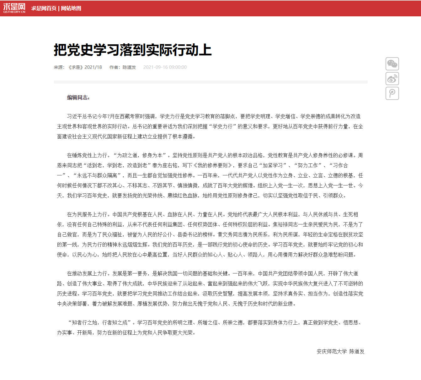 阅读链接:《把党史学习落到实际行动上》(2021年第18期)http://www.qstheory.cn/dukan/qs/2021-09/16/c_1127863546.htm