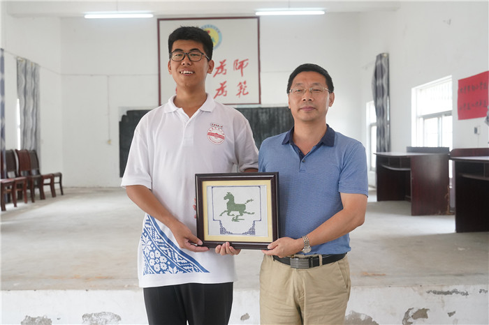 “筑梦挑花”非遗传承实践团学生代表向汪时珍赠送自己创作的望江挑花作品《马踏飞燕》