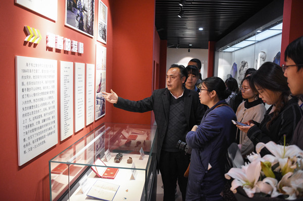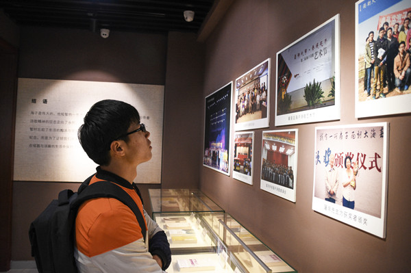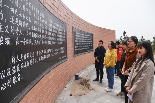 在主题为“海子爱情经历”的展区,一首诗《给B的生日》引起了同学们的兴趣,海子弟弟查曙明向大家讲述了这首爱情诗背后的故事。广场的石壁上,几首关于家园的诗刻在上面,1984年海子写下的成名作《亚洲铜》也刻在这里。参观完纪念馆的同学们聚在墙前,三三两两地合照。