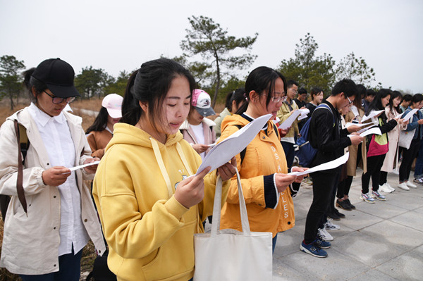 3月25日,怀宁县查湾村,金黄的油菜花田一片接一片,安庆师大白鲸文学社二十余名成员来到海子故居和墓前献花读诗,与海子相约第24个春天。
