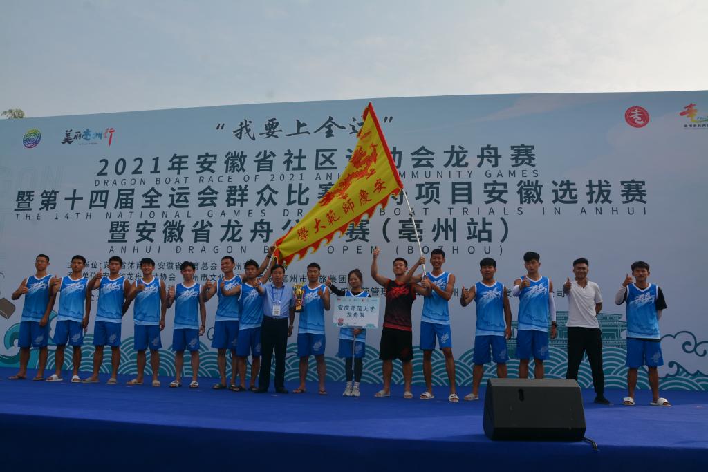 7月4日,安徽省龙舟公开赛(亳州站)在谯城区涡河擂鼓开赛。beat365官网龙舟队参加了14人龙舟男子组200米、500米直道赛两个比赛项目,以团体总分第三的优异成绩荣获一等奖。