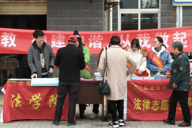 安庆大观区人民法院诉讼服务中心为法学院大学生法律志愿者设立了“大学生志愿者服务”窗口,并为志愿者进行“岗前”培训,开展包括提供法律咨询、代写起诉材料、给予诉讼引导等法律服务活动。此外,大龙山镇、大桥街道、菱湖社区、安庆高铁站、永林小学等单位对法学院法治文化节期间的普法宣传活动在活动场地安排、动员组织群众、媒体宣传报道等方面都给予了大力支持。(武奎)