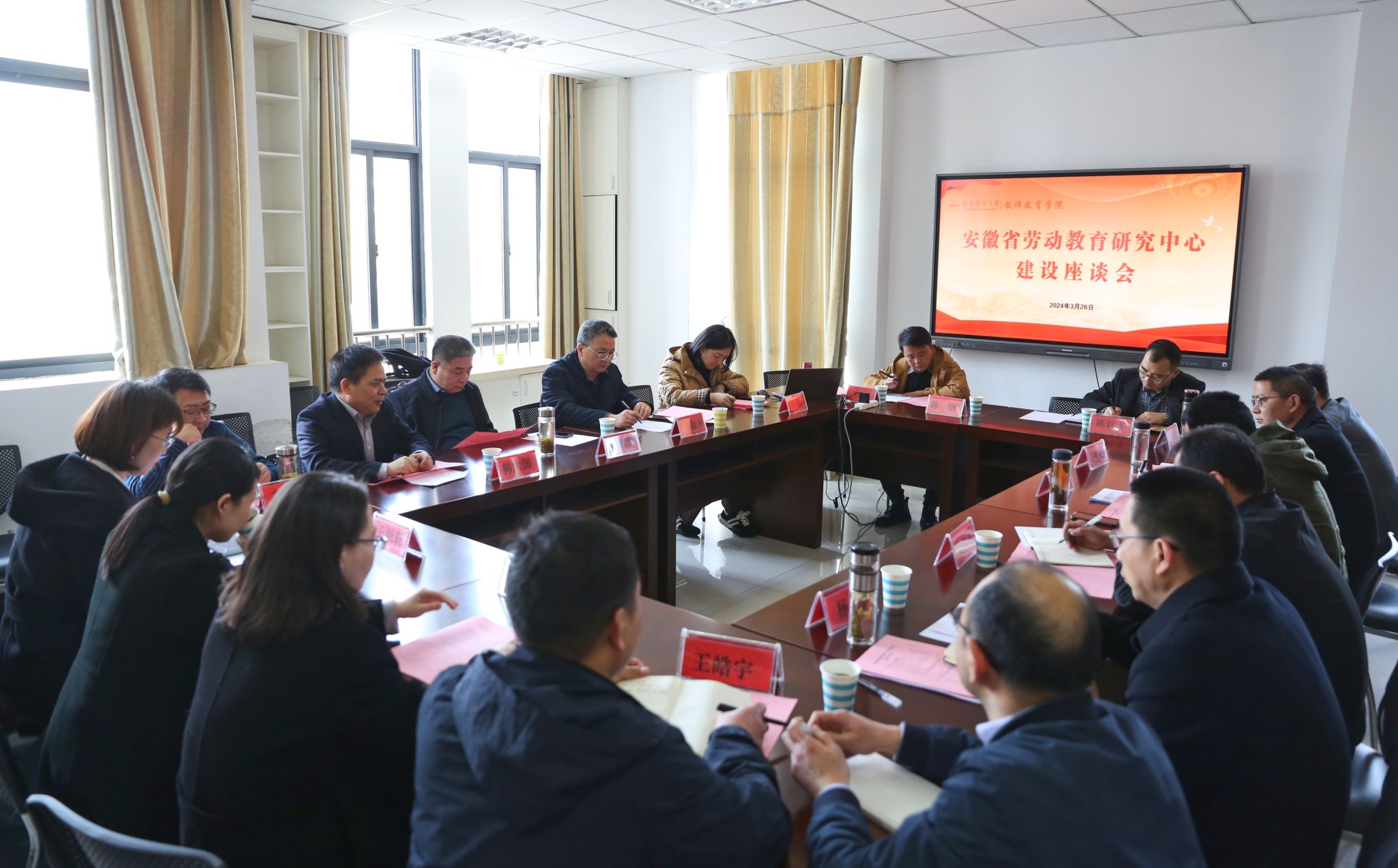 3月26日,学校召开安徽省劳动教育研究中心建设座谈会。安徽省劳动教育研究中心主任、校党委书记李福华主持座谈会。安徽艺术学院副校长、二级教授、博士生导师、安徽省学术和技术带头人、中国高教学会劳动教育专委会副理事长柳友荣,安徽艺术学院教务处处长、安徽省教学名师、安徽省劳动教育教学指导委员会委员韩大国,安徽艺术学院劳动教育研究员孙静,安徽大学出版社副社长钟蕾,安徽中飞希壤数据科技有限公司总经理齐松涛等出席会议。