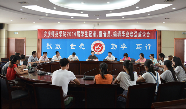 6月24日上午,学校举行2014届广播台、记者团毕业生欢送座谈会。党委书记何小祥亲切会见了2014届学生记者、播音员和编辑,并与他们合影留念。党委副书记、纪委书记殷红出席会议并发表讲话。党委宣传部部长孙永玉、副部长陈东等宣传部全体工作人员,校广播台、记者团14届成员以及11级成员代表参加会议。孙永玉部长主持会议。