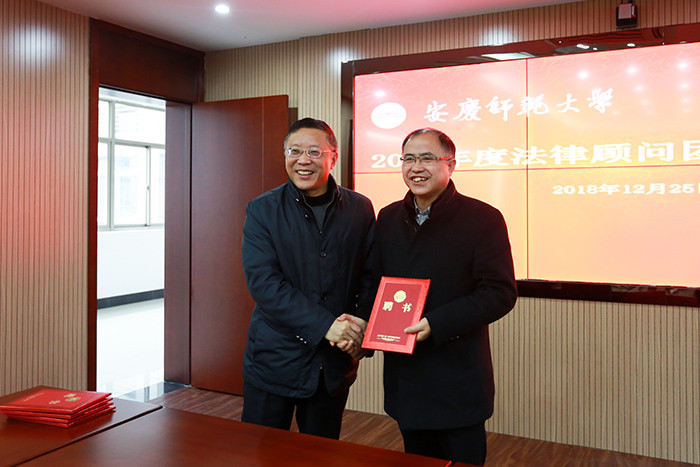 法律顾问团代表,安庆市委政法委执法监督咨询评议委员会委员、市中级人民法院执法执纪监督员、全国优秀律师钱立刚做表态发言。他表示,担任法律顾问既是一种荣誉,更是一份责任。今后将紧紧围绕学校发展大局,认真履职、担当尽责,为全面提升学校依法治校水平做出积极贡献。