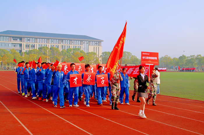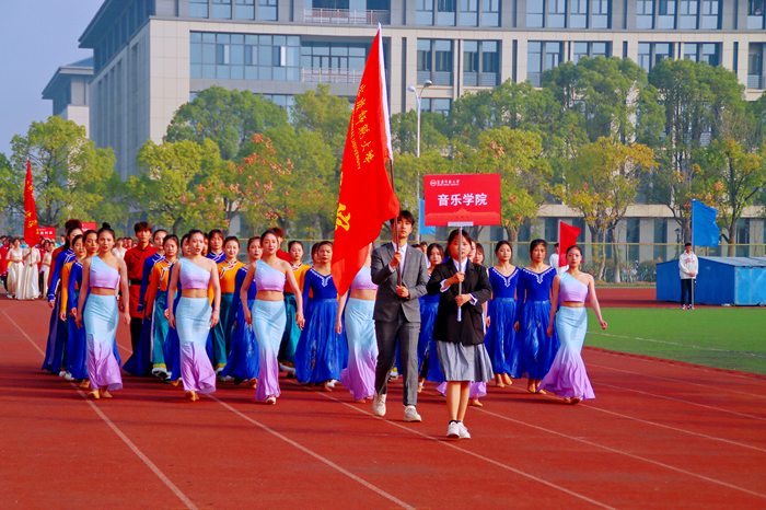 身着特色服装,高举宣誓横幅,呐喊响亮口号,来自学校19个学院的运动员方队将专业特色巧妙融入方阵入场式,迈着矫健的步伐走过主席台。黄梅剧艺术学院“七仙女”飘逸亮相、音乐学院民族舞引热全场、美术学院“红色”画展鼓舞人心……创意的入场设计烘托现场高涨的气氛,充分展现学校学生朝气蓬勃、昂扬奋进、积极向上的精神面貌。