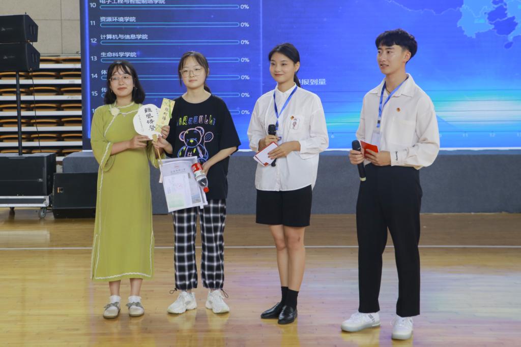 纹饰着“100”与“战士”图样的望江挑花作品;复杂精巧、五颜六色寓意吉祥幸福的结绳工艺作品;镌刻着“不忘初心”“我心向党”字样的主题剪纸作品;由“五星红旗”“长城”等元素组成的微生物艺术画作品……一幅幅精美的艺术作品让手机前的观众大赞精美,这些都是学校公共艺术俱乐部学员的作品。100辆贴着“我为同学做件事”的小推车,承载着新生的行李,也承载了学校师生的关爱;“大学生爱心超市”食堂展销,将拿出一半收益用于2021级新生的志愿服务活动;3000多名校园志愿者活跃在火车站、汽车站、校园内,为新生提供迎新志愿服务活动……这些都被直播镜头一一记录。