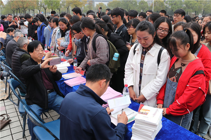 3月29日,《中国作家》杂志组织12位著名作家走进龙山校区开展签名赠书活动,程绍武、老藤、叶兆言、钱念孙、许辉、高伟、阎雪君、潘飞、徐迅、俞胜、许婉霓、秦悦等作家为大学生们签名赠送了200余本书籍。