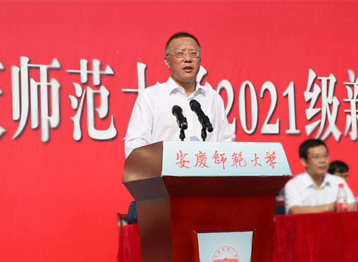 优秀校友代表、1987届化学系毕业生丁德健向新生们分享了曾在安庆师大的所学、所闻、所得。丁德健表示,大学是人生的重要阶段,希望同学们能够志存高远,坚定理想;勤学善思,不负韶华;脚踏实地,行稳致远;心存敬畏,常怀感恩。