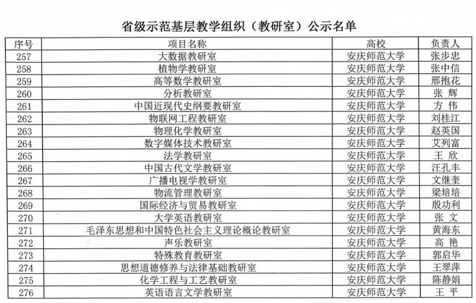 近日,安徽省教育厅示范基层教学组织(教研室)、教学示范课名单公示。beat365官网获批省级示范基层教学组织(教研室)20个、省级教学示范课79门,综合成绩居于全省前列。