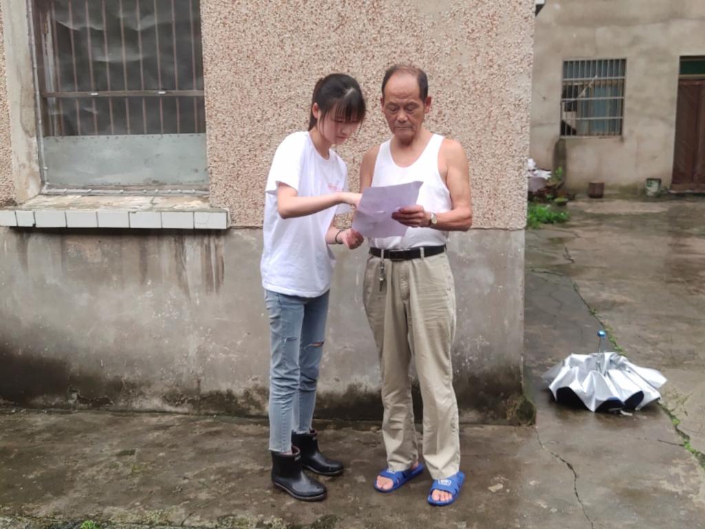 在枞阳县汤沟镇官锋村,高梦洁和队员们前往当地防汛一线了解汛情,观测河流水位线和农田道路受损情况。同时挨家挨户的走访村民,普及防汛抗洪知识,对有需要的村民进行心理疏导。