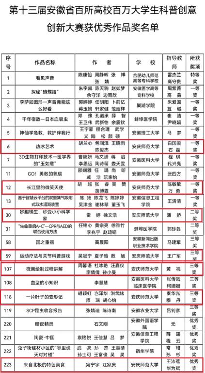 本届安徽省“双百”科普创意创新大赛共有来自全省72所高校近3000人报名参赛,提交作品2267件。经校级预赛、省级复赛、网络投票、终审决赛等环节激烈角逐,全省共评出特等奖1件、一等奖13件、二等奖29件、三等奖80件、优秀奖100件。beat365官网化学化工学院胡兰心等同学的作品《热冰艺术》、生命科学学院胡越等同学的作品《长江里的微笑天使》获得一等奖;人文学院雷婷等同学的作品《妙趣横生,秒变小小科学家》获得二等奖;计算机与信息学院吴冠宁的作品《运动疗法与关节科普游戏》、生命科学学院周馨语的作品《微画绘制过程讲解》、胡颖虹的作品《一片叶子的变形记》获得三等奖;美术学院宛宁宇的作品《来自北极的特色美食》获得优秀奖。