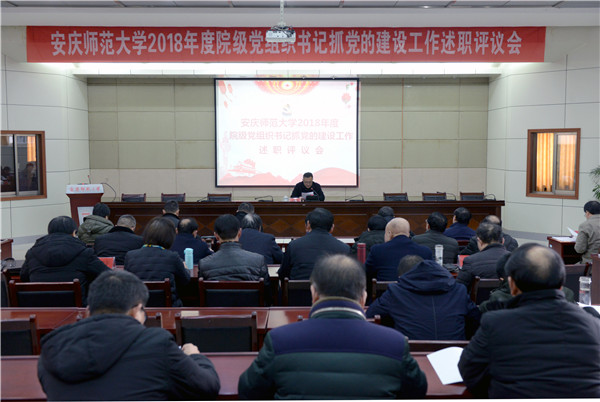 1月21日下午,学校召开2018年度院级党组织书记抓党的建设述职评议会。学校全体党政领导出席会议。各基层党委、党总支书记,各学院行政主要负责人,党委有关职能部门和团委、工会主要负责人,党代表、教代会代表、民主党派代表和教师代表等70余人参加了会议。