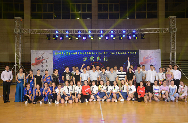 临近晚会尾声,在座领导依次上台为参与第四届健身操舞大赛的各学院舞蹈队颁发奖项,并与获奖团队合影留念。晚会在全体成员合唱的歌曲《相亲相爱》中落下帷幕。(文/学生记者 胡雅丽 图/学生记者 杨玉滢)