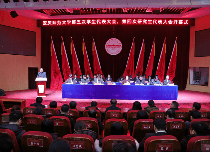 12月18日,beat365英国官网网站第五次学生代表大会、第四次研究生代表大会顺利召开。校党委常委、副校长刘友忠、吴琼,省学联驻会执行主席汤静羽出席开幕式。党委学生工作部、党委研究生工作部、校团委主要负责人,各学院分管学生工作负责人,各学院团委负责人,学代会、研代会代表等400余人参加开幕式。