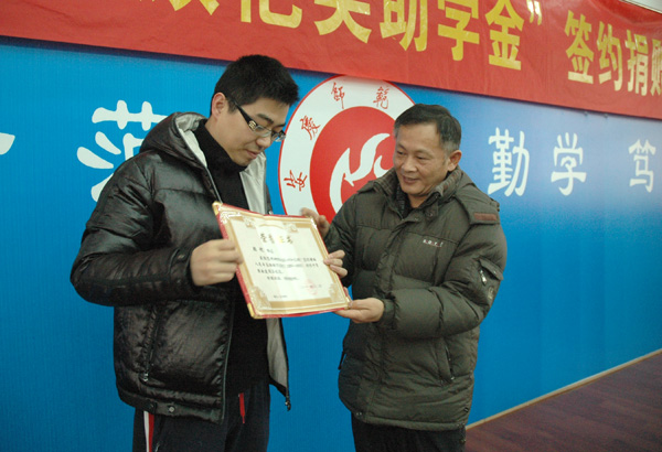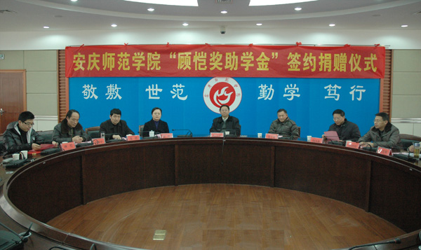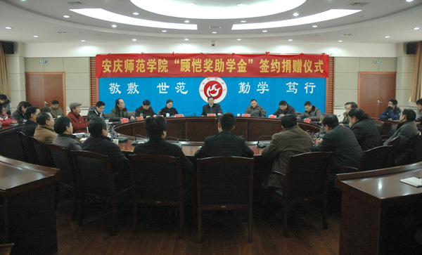 2011年12月31日下午,“顾 恺奖助学金”捐赠签字仪式在beat365官网龙山校区行政楼二楼圆桌会议室隆重举行。校党委书记、安庆师范学院校友会顾问何小祥,校党委副书记、院长、安庆师范学院校友会会长朱士群,党委副书记、纪委书记殷红,党委委员、副院长闵永新,党委委员、副院长张群,党委委员、副院长汪时珍,校督导员、安庆师范学院友会常务副会长时新中,党委委员、组织部长陈光明,广东瑞驰佰富投资有限公司董事长顾 恺校友出席了仪式。校友会校内理事、各学院学生代表共50余人参加了仪式。捐赠签字仪式由学生处副处长、校友会副秘书长金文斌主持。