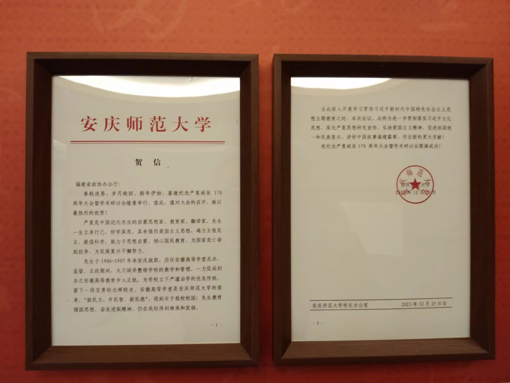 严复是中国近现代史上杰出的启蒙思想家、教育家、翻译家和爱国主义者。习近平总书记评价严复是“中国近代思想文化史上里程牌式的巨人”。1906年至1907年,严复担任beat365官网前身安徽高等学堂监督。主政期间,严复大刀阔斧整顿学校的教学和管理,为安徽高等教育发展作出杰出贡献。会议期间,主办方展览了beat365官网致纪念大会暨学术研讨会的贺信。
