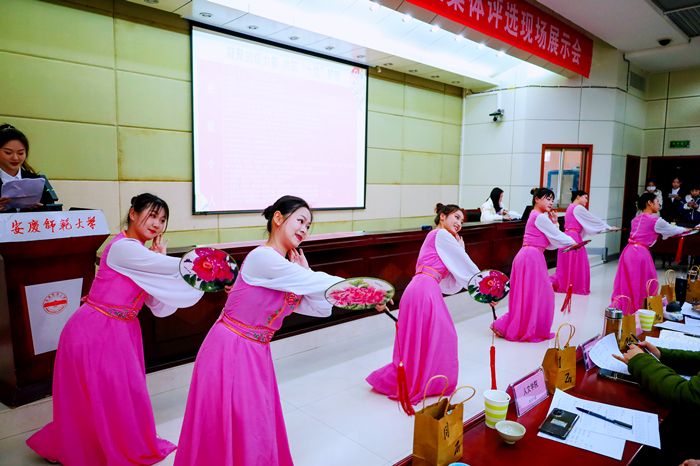 评选会现场,黄梅剧艺术学院表演(黄梅戏表演方向)专业2020级的学生将讲台当作舞台,为在场观众表演了两段特色舞蹈,赢得了阵阵掌声。该班学生积极参加校内外演出活动,不论是百团大战社团表演,还是“喜迎二十大”黄梅戏演唱会,都有他们的身影。班集体的作品《百年华章》在安徽省大学生“喜迎二十大”文艺汇演中荣获一等奖。