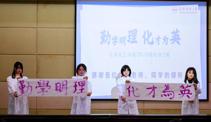 将毛笔蘸上用酒精配制的酚酞溶液,在宣纸上书写汉字,最后喷上低浓度的氢氧化钾(碱性)溶液,在“酚酞遇碱变红”的化学原理下,“勤学明理、化才为英”的文字得以显现。这场来自化学化工学院化学专业2020级(3)班的现场实验表演获得了台下观众的高度关注。日常活动中,该班级积极开展“汇聚爱‘Zn’—爱心义卖”等主题活动,学生们亲手制作洗手液、肥皂等日用品进行义卖,募捐筹得两千余元,充分展现了专业特色。