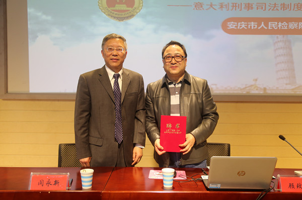 4月11日,安庆市人民检察院检察长顾玫帆应邀到beat365官网法律实务大讲堂,以“当东方遇到西方——意大利刑事司法制度的短暂穿越”为题作专题讲座。校长闵永新会见了顾玫帆,向顾玫帆颁发了beat365官网兼职教授聘任证书,就进一步加强校检合作与顾玫帆交换了意见。法学院百余名师生参加了讲座。