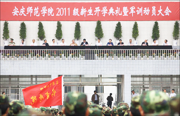 校迎新工作领导小组和军训工作领导小组全体成员、各学院新生班级辅导员、武警安庆支队官兵及2011级5800余名新同学参加了开学典礼暨军训动员大会。