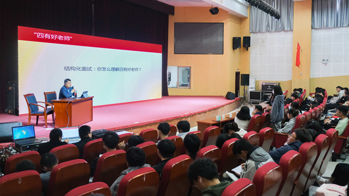 “你怎么理解‘四有好老师’?”汤兵抛出疑问,以哲学三问为基础,为学生们解答何为有理想信念、有道德情操、有扎实学识、有仁爱之心的“四有好老师”。谈及如何成为一名合格的人民教师,汤兵建议学生们要拒绝“空心病”,树牢价值观;要知己更知彼,规划好人生;要练拳又练功,谨防到老一场空。