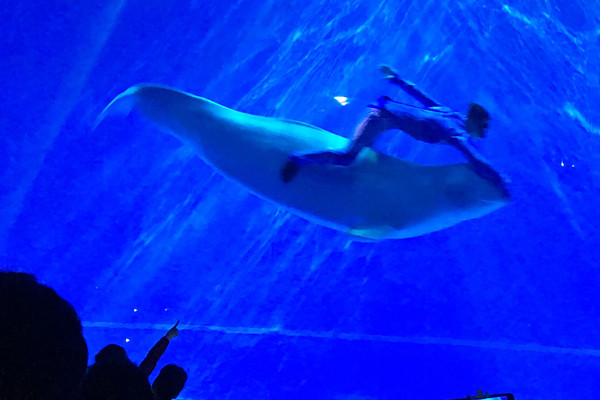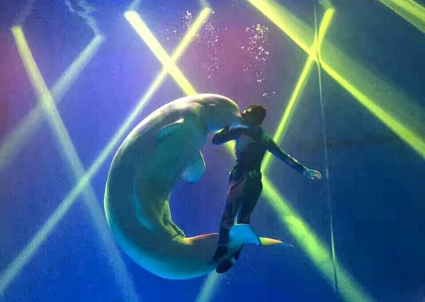 生命科学学院生物技术专业2016届毕业生张瑞瑞在进行大白鲸表演