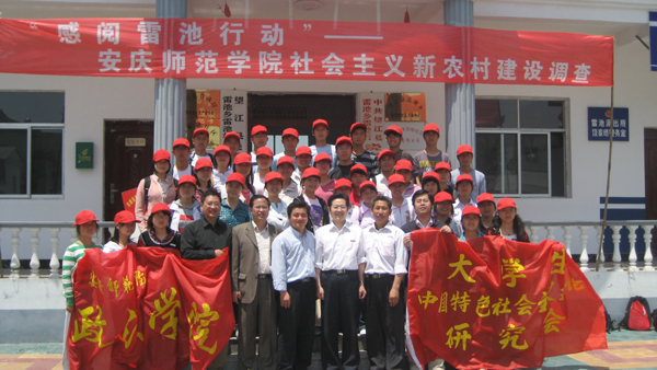 5月10日,大学生中国特色社会主义理论研究会赴安庆市望江县雷池乡雷池村饶家墩社区开展了“感阅雷池行动——社会主义新农村建设调查活动”。大学生中国特色社会主义理论研究会专业指导老师孙晓峰、焦少林、邵军、白树震、冯爱霞、焦力军、郑柏琼,教育学院副院长马俊,特色理论研究会社团辅导员以及40名会员参加了此次活动。