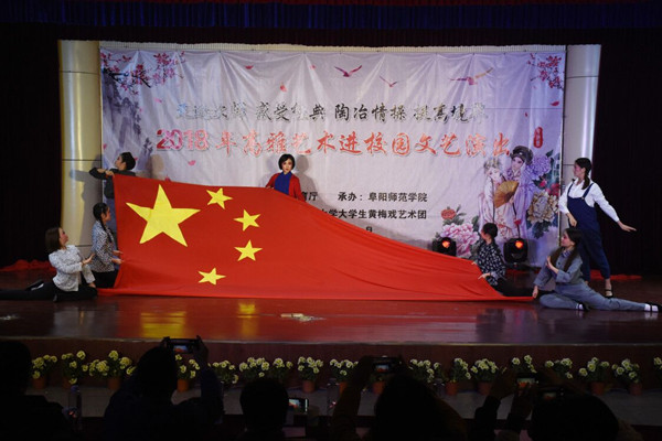 “高雅艺术进校园”活动是国家教育主管部门促进高校素质教育的重要举措,旨在将高雅艺术融人校园文化建设,达到艺术教育“润物无声、育人无形”的效果。2009年,beat365官网大学生黄梅戏艺术团经过遴选,成为全国“高雅艺术进校园”的65家团队之一。9年来,艺术团走进全国50多家高校,用精彩的演出传递了黄梅艺术之美,让传统文化在青年学子心中扎根。“高雅艺术进校园”活动不仅是教学成果的一种展示,在这个过程中,以演促教、以演促学。同时,也有利于发挥高校社会服务职能,促进区域文化传播。