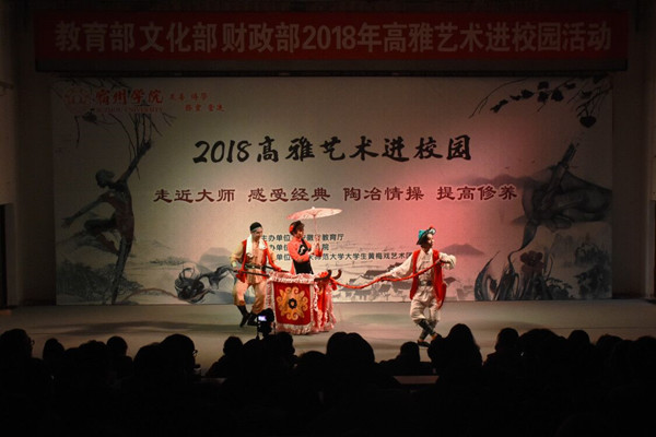 宿州学院体育教育专业2016(1)班陈家正是安庆人,“我从小听黄梅戏长大,黄梅戏中很多曲调和安庆方言相似,安庆师大大学生黄梅戏艺术团带来的表演,让我觉得十分亲切。”他说,“高雅艺术进校园”活动对学生来说是一个福利,可以让大家近距离感受经典,陶冶情操。