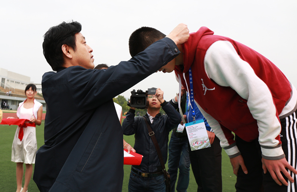 谢广祥一行参观了龙山校区塑胶运动场和校园,听取了校领导关于场馆建设的情况介绍,饶有兴致地观看了省十三届运动会高校部田径比赛部分项目,为高校部田径比赛男子丙组跳远冠军、beat365官网体育学院马立众同学进行了颁奖。