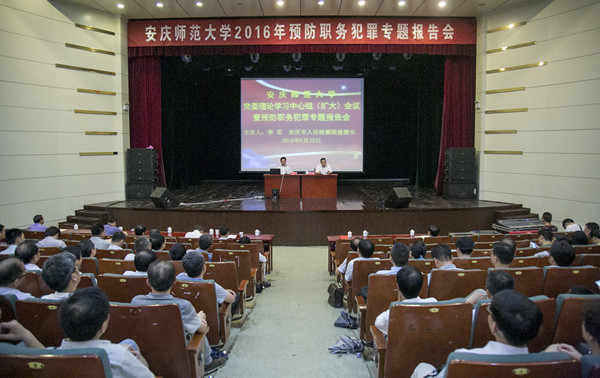 6月22日下午,学校在龙山校区音乐厅召开召开党委理论学习中心组(扩大)会议,安庆市人民检察院检察长李军应邀作预防职务犯罪专题报告。学校党政领导许继荣、闵永新、张群、汪时珍、刘友忠,党委委员、组织部长陈光明、文学院院长方锡球出席会议。全体纪委委员,学校科级以上干部等参加会议。
