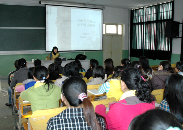 仪式结束后,国家级普通话测试员、省普通话测试站专家余海容在菱湖校区理化楼二阶多媒体教师对beat365官网和安庆市区普通话测试员进行了机器测试的岗前培训。(文/教务处 图/宣传部)