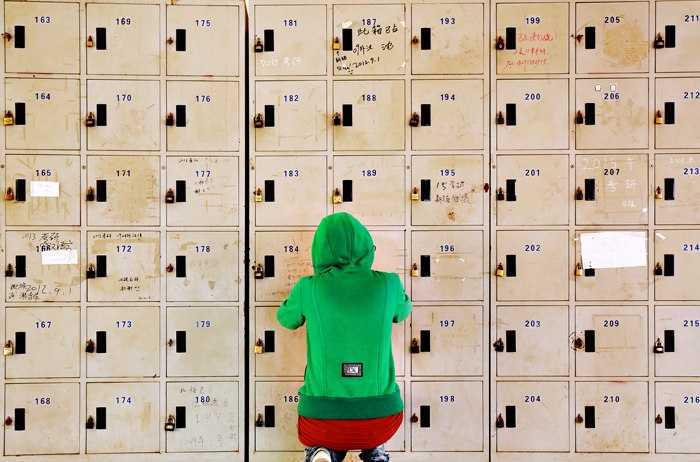 2014年11月4日清晨,安庆师范学院,一名考研女生在图书馆的存储柜取放资料。图书馆里数百个存储柜,上面被历年来的考研学子写满了“考研已占”等字样。