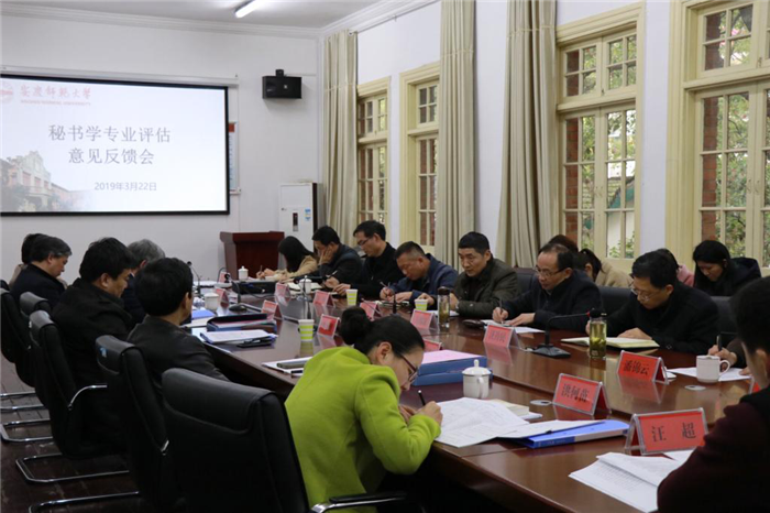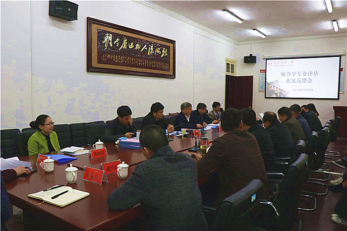3月22日,由陕西师范大学文学院院长、国务院学科评议组成员张新科教授、南京师范大学文学院院长高峰教授、河南师范大学文学院院长李永贤教授、安徽大学文学院院长吴怀东教授、淮北师范大学文学院院长周有斌教授等组成的安徽省普通本科秘书学专业评估专家组一行6人莅临beat365官网,开展秘书学专业评估工作。校党委常委、副校长张群教授,文学院领导班子,教务处、人事处、科研处、学生处等职能部门主要负责人参加了秘书学专业评估意见反馈会。