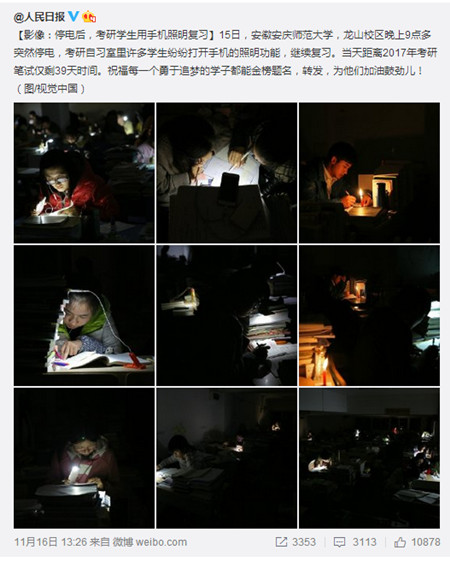 腾讯:安徽一高校突然停电 考研学生用手机照明继续复习