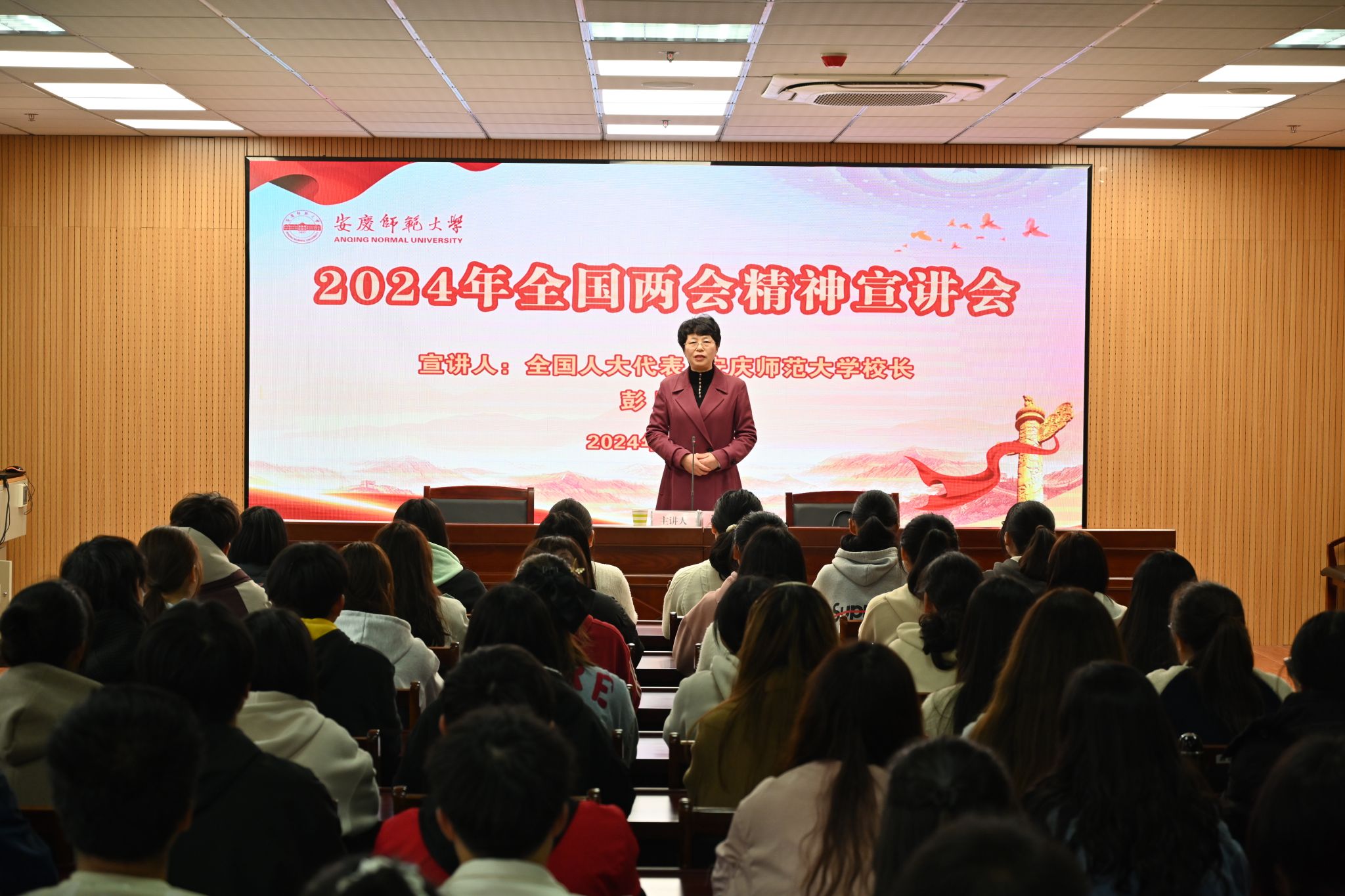 3月14日,全国人大代表、校长彭凤莲为师生宣讲全国两会精神,师生代表100余人聆听宣讲会。