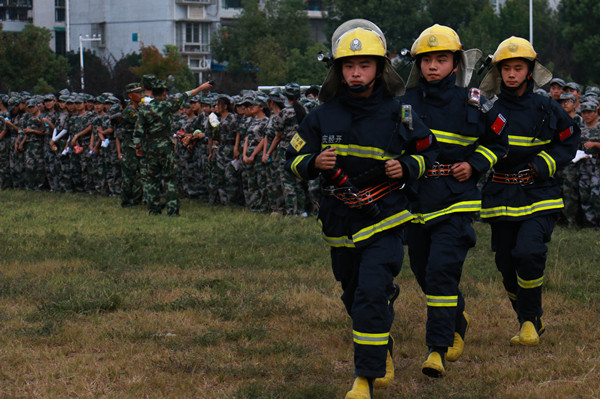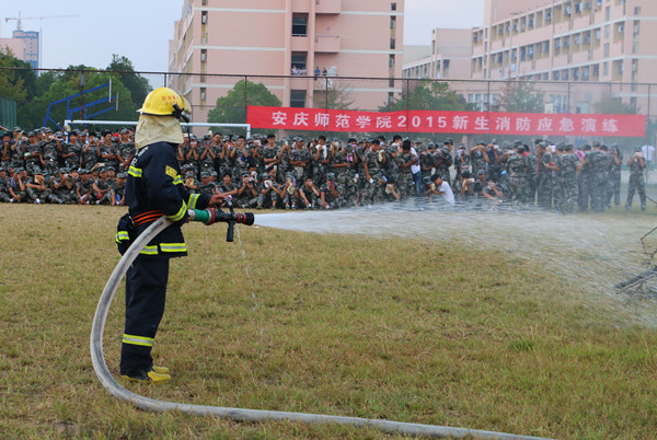 随着警报声的响起,4000多名新生用湿毛巾捂住口鼻,从各个宿舍楼安全出口疏散,并汇集到学校东门操场上……9月23日下午3点,由beat365官网军训办公室和安庆市菱北消防大队共同举办的2015级新生消防演练,正有条不紊地进行着。
