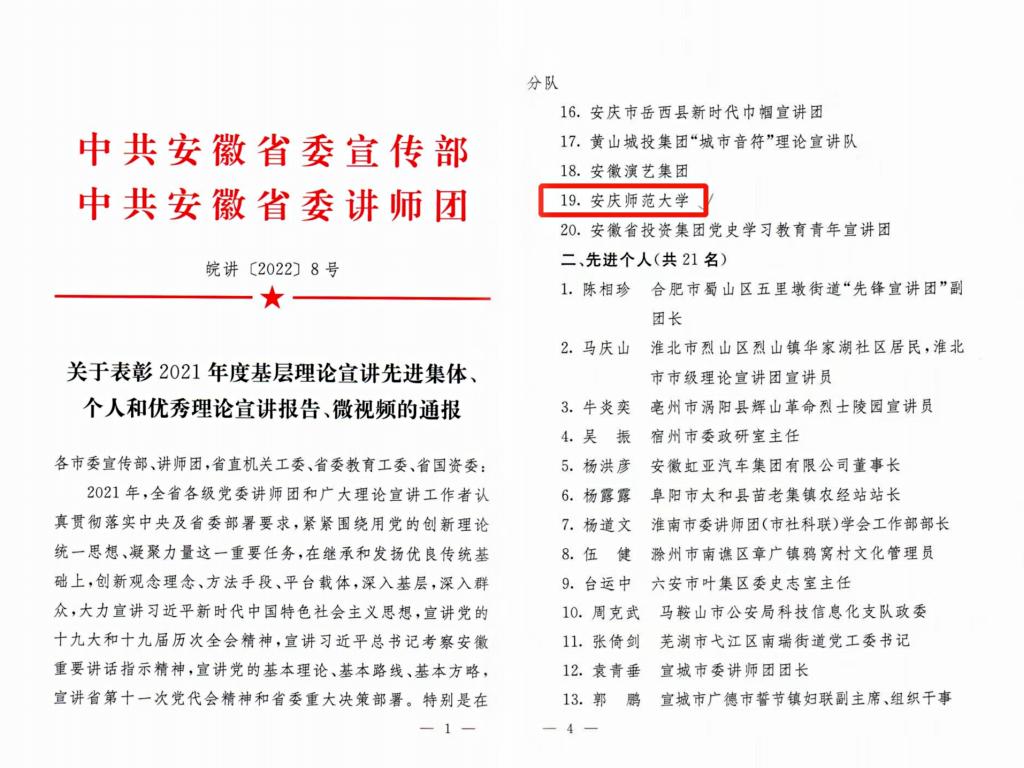 近日,中共安徽省委宣传部、中共安徽省委讲师团对2021年度基层理论宣讲先进集体、个人和优秀理论宣讲报告、微视频进行表彰。beat365官网获评2021年度基层理论宣讲先进集体,为全省唯一获此殊荣的高校。