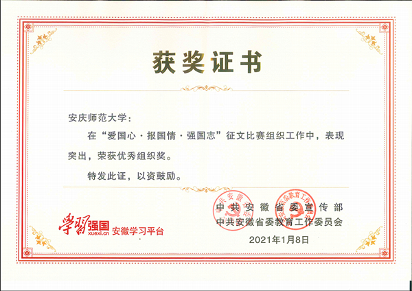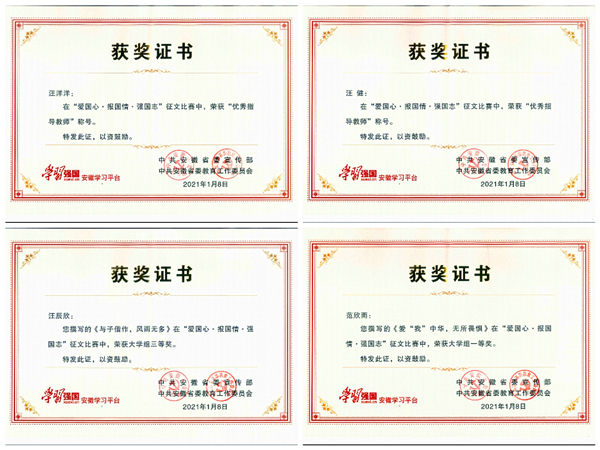 学校高度重视此次征文活动,前期进行了精心部署,在全校范围内举办了以“爱国心•报国情•强国志”为主题的征文活动。校团委广泛动员并组织专家对作品进行评审,评选出一等奖4篇、二等奖9篇、三等奖17篇、优秀奖30篇,党委宣传部择优报送50篇优秀作品至“学习强国”安徽学习平台。